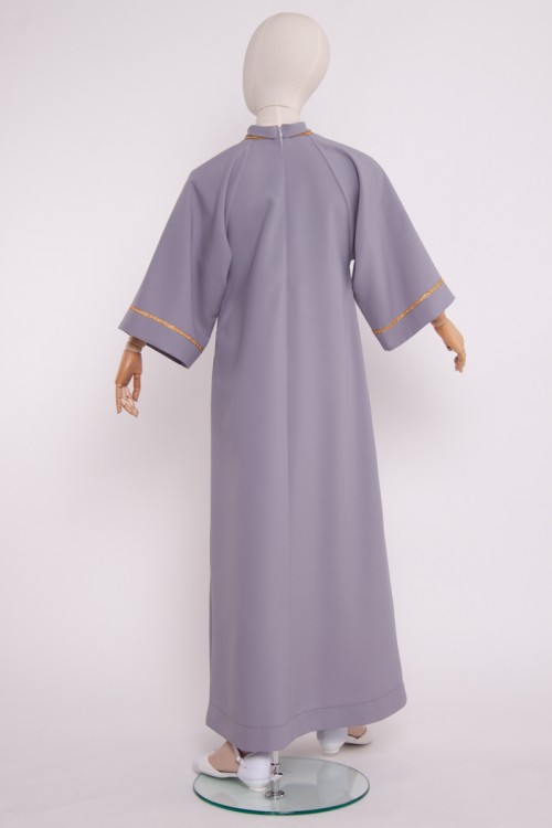 Bellissimo, grigio un camice per cori. Il camice presentato ha un taglio con collo dolcevita e maniche larghe 5/6, che sono state rifinite nastro d'oro. La veste è fissata con una cerniera.