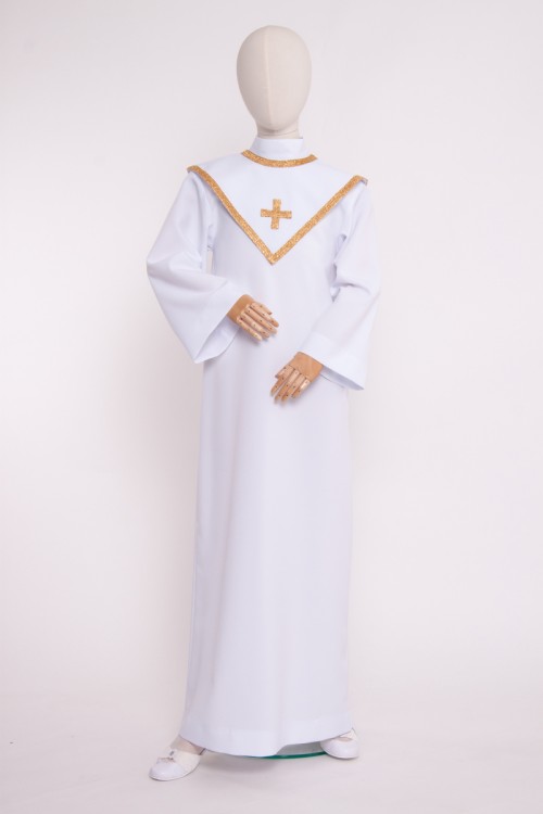 La forma classica triangolare del colletto del modello presentato è un'idea interessante per un vestito destinato a chierichetti, lettori, cori o gruppi di musica sacra. Il modello presentato è un colletto a forma di triangolare applicato separatamente, molto ben rifinito con un nastro dorato. Nessun fermaglio.