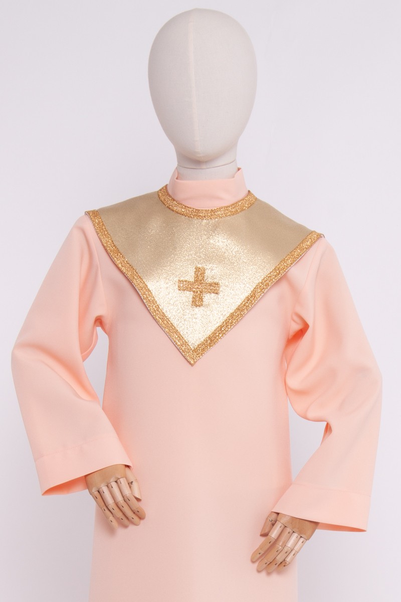 I membri di un gruppo musicale o di un coro della chiesa fondato nelle chiese parrocchiali sono interessati a un indumento che possa decorarli durante le belle cerimonie. I nostri prodotti sono stati creati pensando a tali esigenze. L'abito presentato è composto da due parti: un camice leggero e casual con maniche lunghe e un colletto accattivante. Il costume del coro è un camice pesca e un colletto decorato con un nastro dorato e una croce. Il tessuto da cui è cucito questo set si distingue per la sua leggerezza, vaporosità e comfort dell'utilizzo.