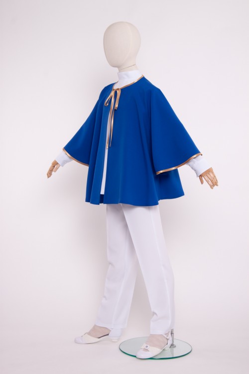 Un mantello fantasioso zaffiro con maniche fino all’altezza del gomito, destinato a cori o altre formazioni, è un'idea per un abito da coro per bambini, adolescenti e anche adulti. Per il suo stile, è dedicato principalmente a ragazze e donne, ma i ragazzi possono indossarlo in colori scuri, ad esempio blu navy o nero, come contrasto. Il taglio dell'outfit è svasato davanti e dietro e ha le maniche larghe. La decorazione è un rivestimento in oro cannella, che fa sia da una legatura che da una decorazione delle maniche.