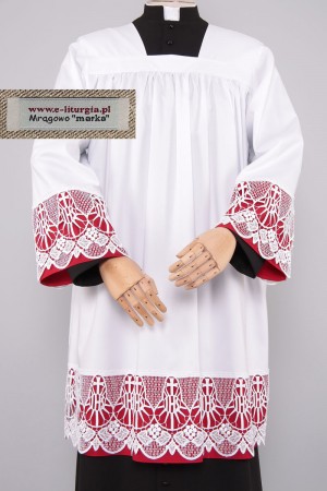 Cotta per prelati realizzata con un tessuto naturale cioè cotone con una mescolanza di viscosa, dedicata ai sacerdoti. L'esclusivo paramento liturgico è decorato con una guipure alta 18cm che contrasta magnificamente con il rivestimento rosso. La varietà di pizzi riccamente decorata è cucita sulle maniche e sull'orlo e foderata con tessuto rosso.