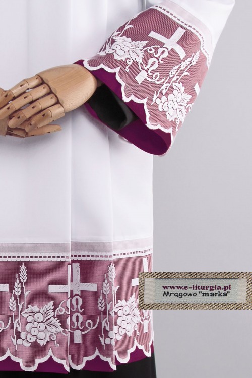 Cotta con ornamenti in tessuto traforato, dedicati ai prelati. La veste dal taglio classico caratterizzata da un delicato pizzo sullo sfondo viola. Il fondo delle vesti e delle maniche è rifinito con inserti traforati in tessuto di poliestere 22cm di altezza con fodera viola. Il motivo liturgico classico è molto diffuso ed elegante allo stesso tempo. Disponibile in due tipi di materiale: gabardine (poliestere) e cotone con viscosa.