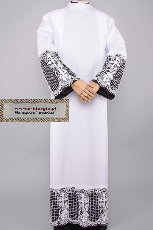 Bella ed elegante Camice con guipure riccamente decorato. Inserti alti 30cm (guipure n.1) sono posti sulle maniche e nella parte inferiore della veste. Guipure secondo un'idea d’autore e realizzata come prodotto polacco di altissima qualità. Disponibile in gabardine o cotone con viscosa.