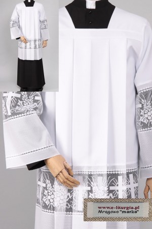 Cotta per sacerdoti in colore bianco con delicate decorazioni traforate con un bel motivo liturgico. Le maniche e il fondo sono rifiniti con inserti in pizzo. Disponibile in due tipi di materiale: gabardine (poliestere) e cotone con viscosa.