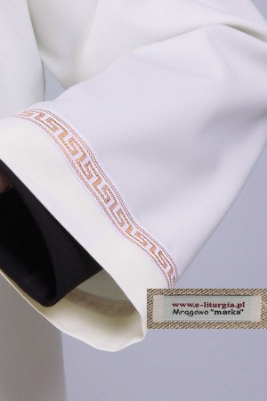 Stilosa, semplice ma elegante nello stesso tempo Cotta sacerdotale. È decorata con un nastro per merceria con un motivo antico in colore oro. Eleganti decorazioni sono state poste sulle maniche e sul fondo della veste, rendendola eccezionale. Versione tessuti: gabardine (poliestere), lana-poliestere.